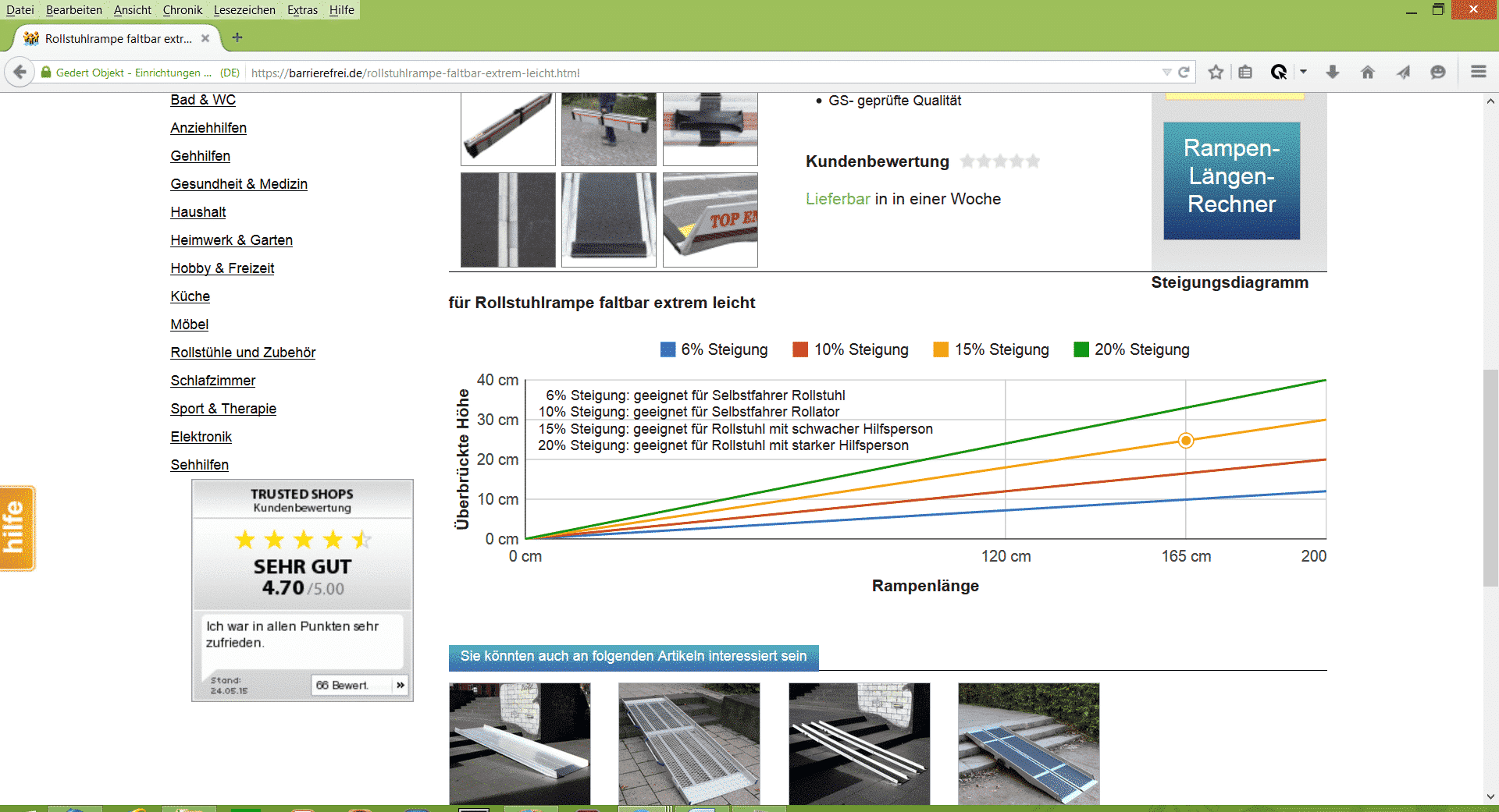 Die Experten vom Online-Portal barrierefrei.de empfehlen für Rollstuhlrampen: Für Selbstfahrer eines Rollators kann die Steigung bis zu zehn Prozent betragen, für Rollstuhlfahrer mit eher schwacher Hilfsperson 15 Prozent und für Rollstuhlfahrer mit starker Hilfsperson 20 Prozent Steigung. Auf dem Portal finden sich zu jeder Rampe passend Diagramme, die die korrekte Rampen Länge für die jeweilige Steigung darstellen.